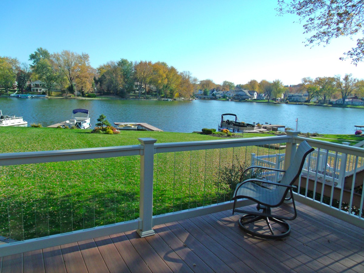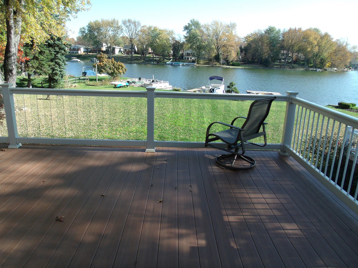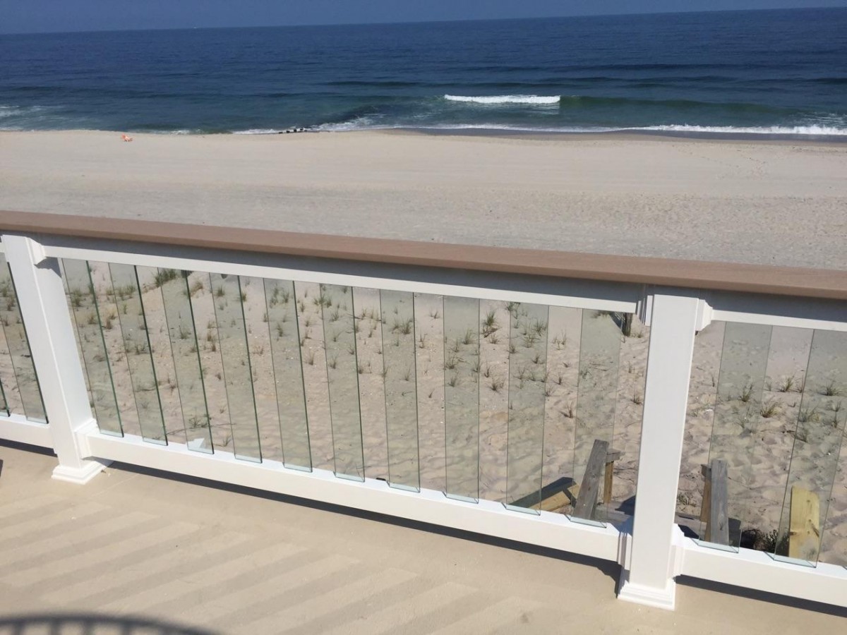 A vinyl rail with glass inserts on top of Gorilla Deck in Mocha Walnut.